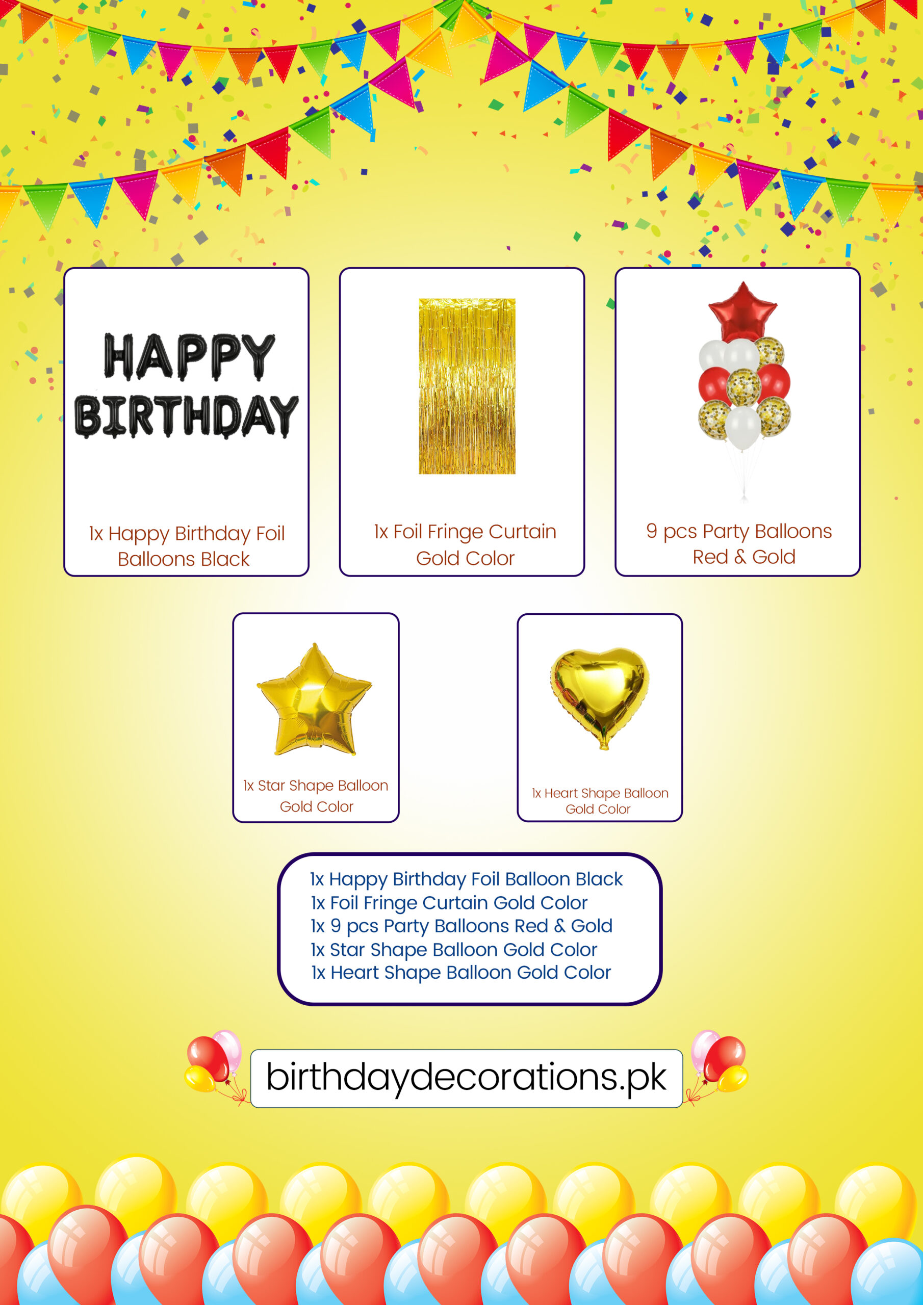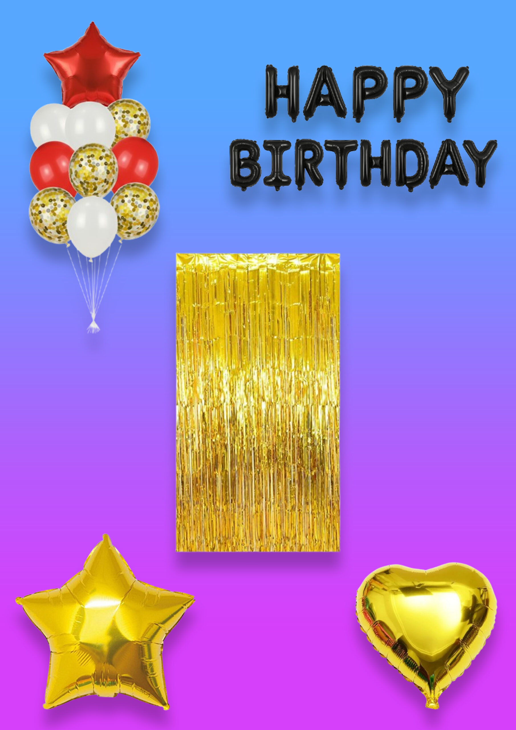 - Hang Banner: Inflate the individual Black Foil Letter Balloons using the provided straw (air-fill only) and hang the “HAPPY BIRTHDAY” banner across the center of the gold curtain.