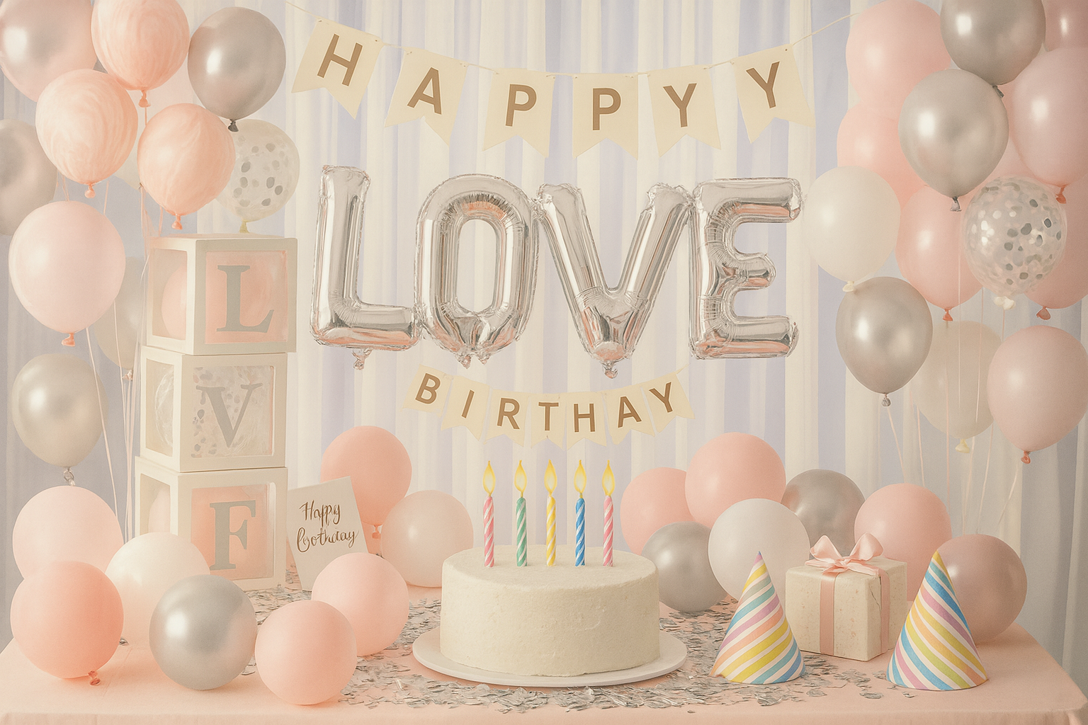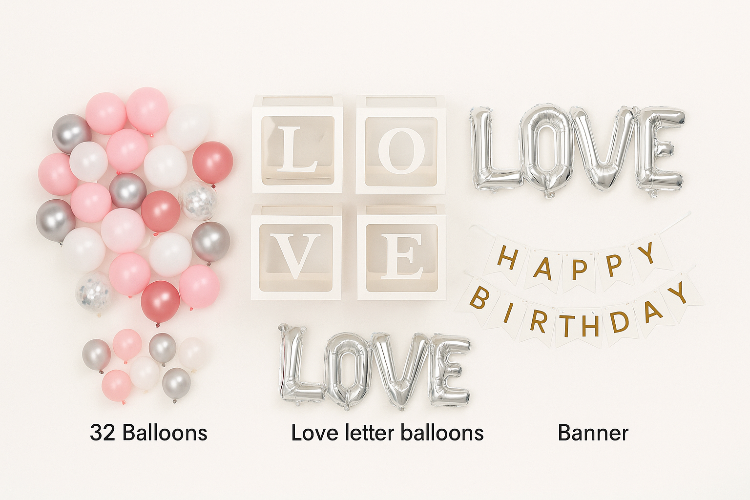 The Happy Birthday LOVE Balloon Decoration Set is the perfect choice for creating a warm, elegant, and festive atmosphere for birthday celebrations. This set includes shiny silver LOVE foil balloons, a Happy Birthday banner, colorful latex balloons, and stylish decorative elements that easily transform any space into a party venue.