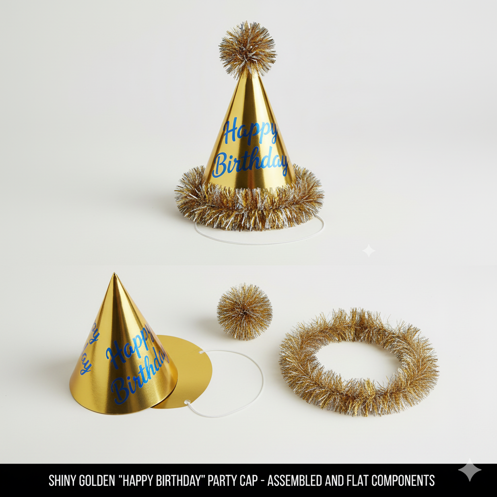 Make the guest of honor feel special with this dazzling Shimmering Gold “Happy Birthday” Party Hat. This cone-shaped hat is covered in a highly reflective metallic gold finish that instantly elevates any celebration, adding a touch of glamour and fun. The front is boldly printed with “Happy Birthday” in a contrasting blue script, ensuring the guest of honor stands out.