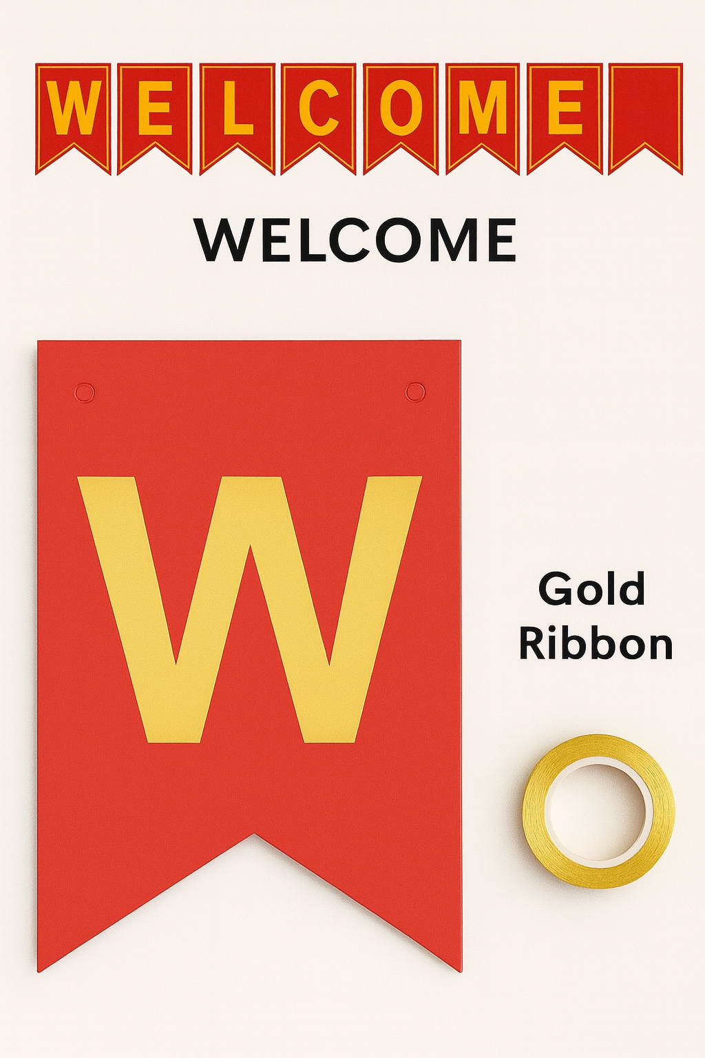 • 1 Set of WELCOME letter flags (red with golden letters).