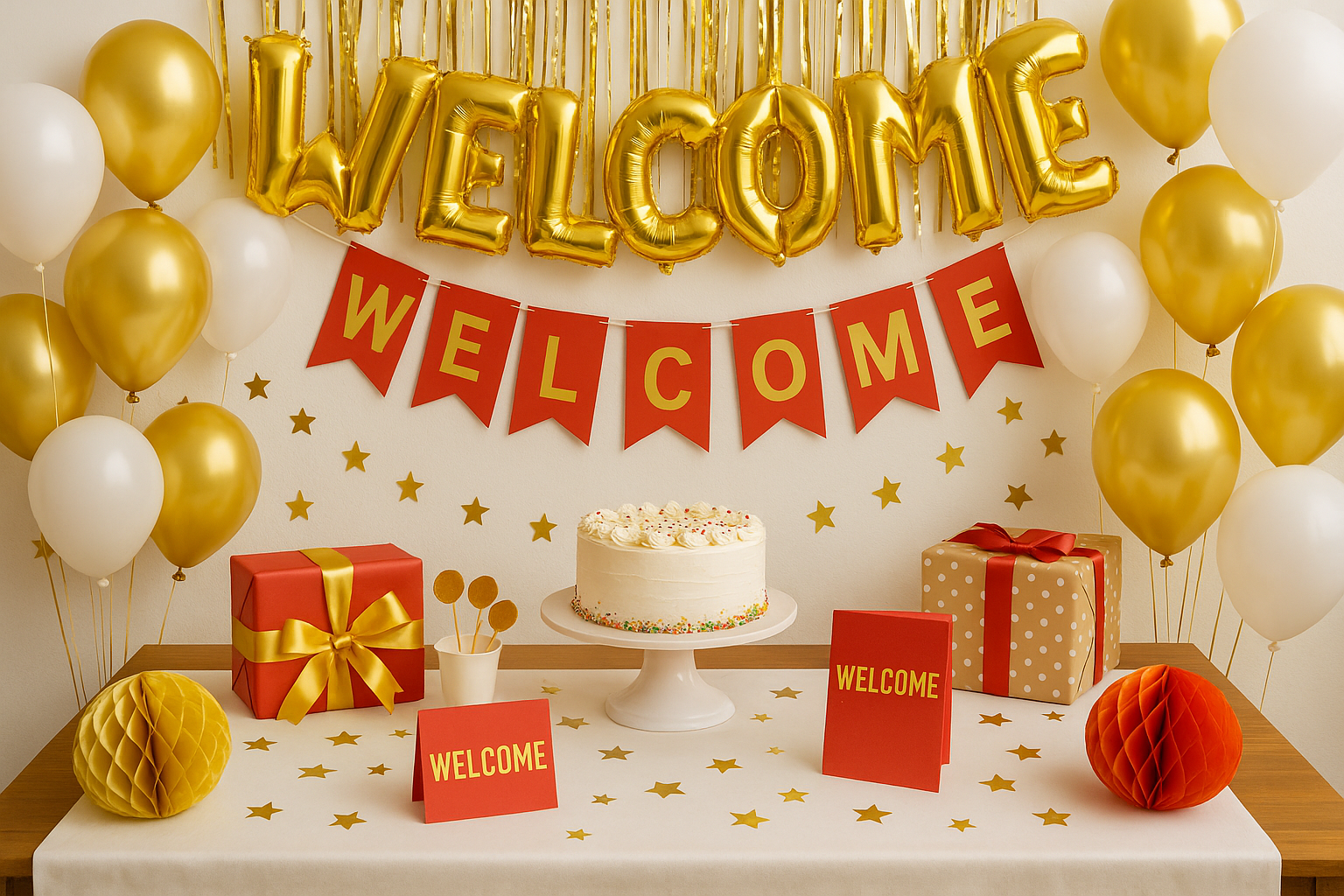 • Letters: W, E, L, C, O, M, E (each printed in golden foil).